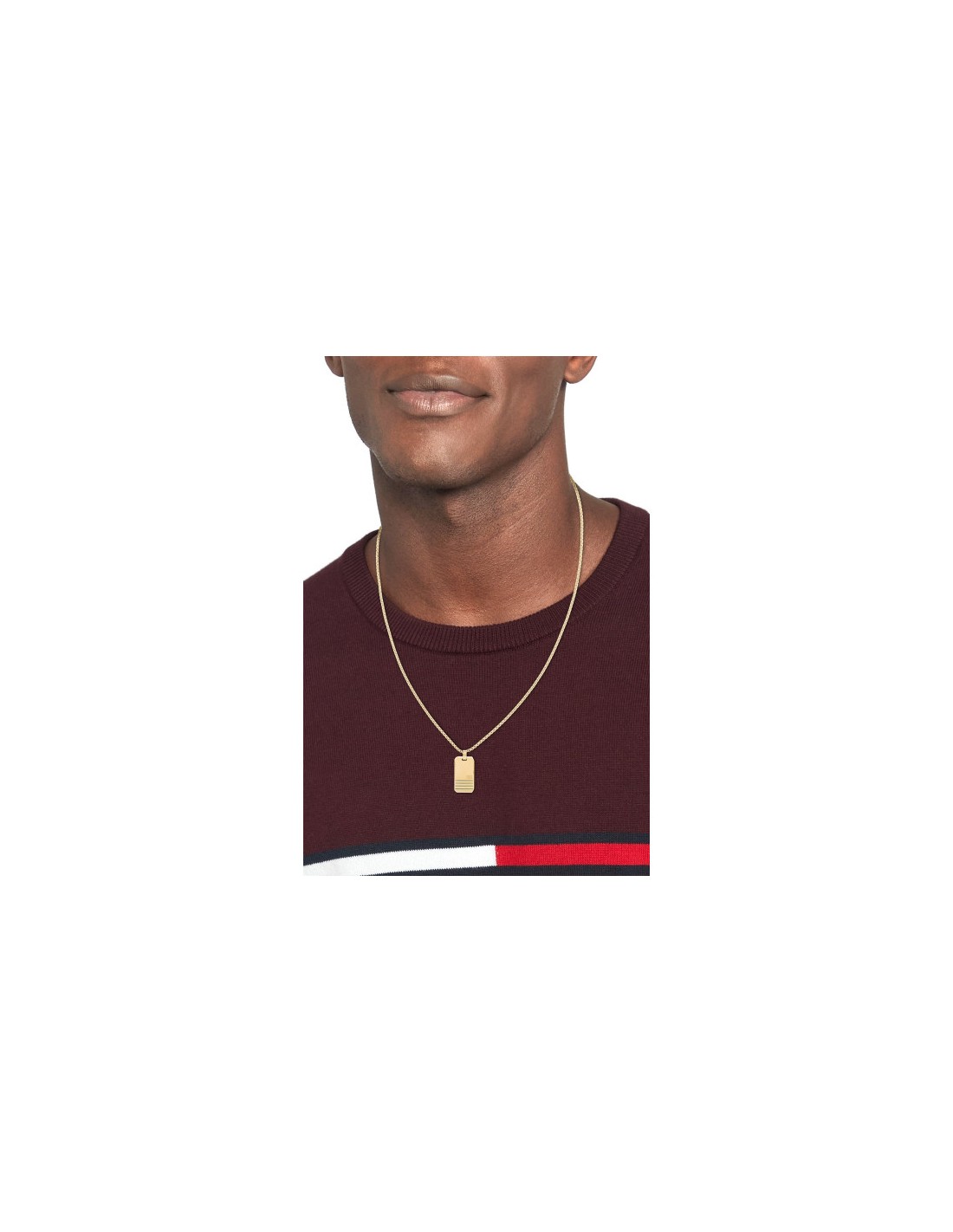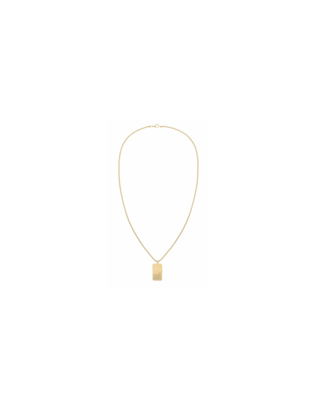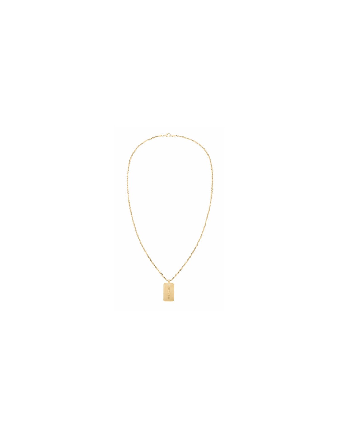 Gargantilla Tommy Hilfiger para hombre fabricada en acero inoxidable dorado compuesta por una atractiva cadena que da lugar a un colgante en forma rectangular con el logo de la marca. Su cierre es de mosquetón.