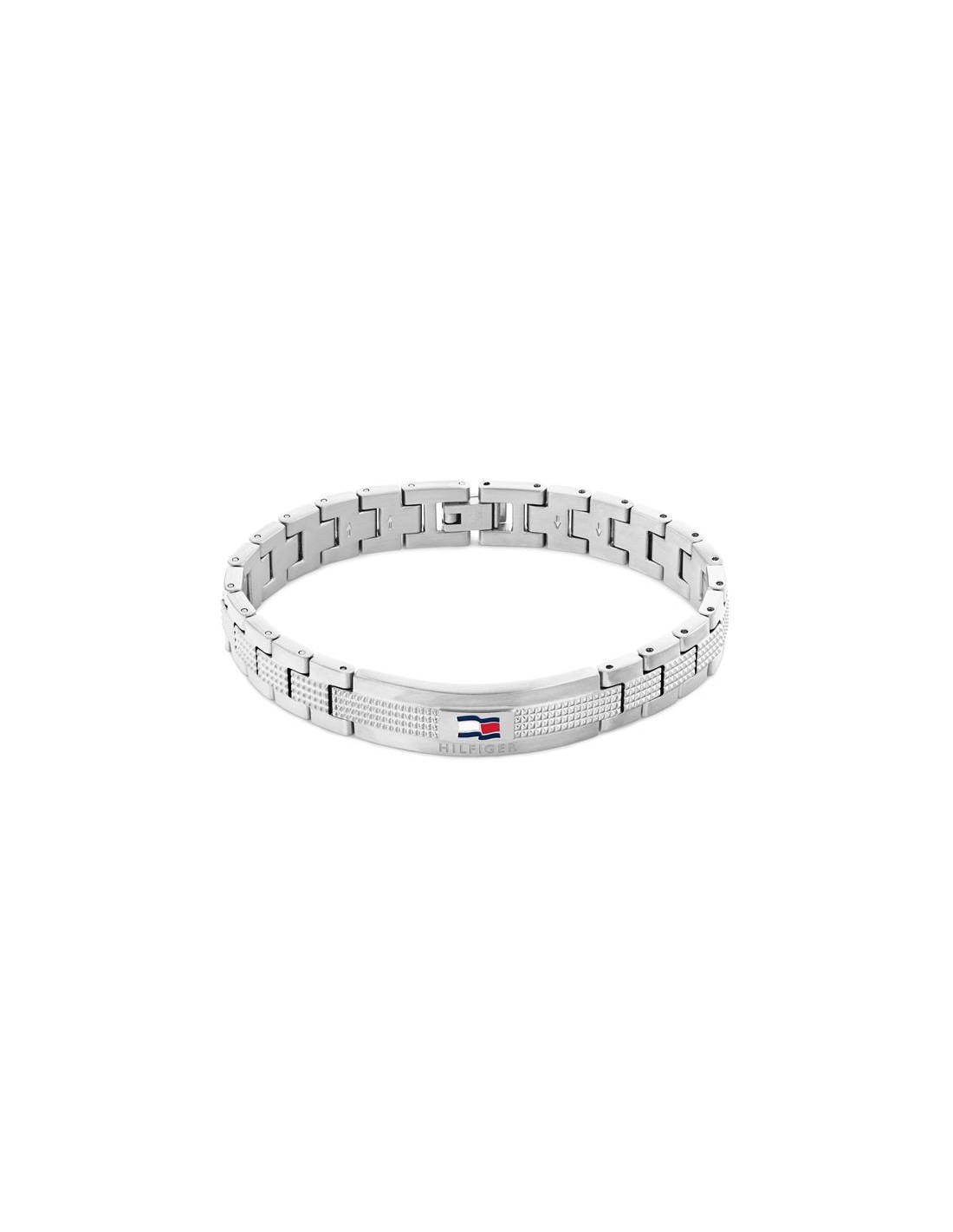 Pulsera Tommy Hilfiger para hombre fabricada en acero inoxidable plateado. En su parte central cuenta con la bandera de la marca y su cierre es desplegable.