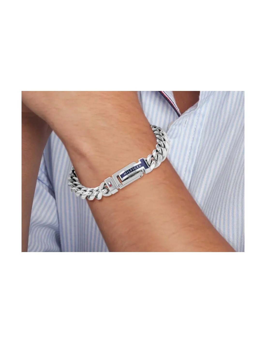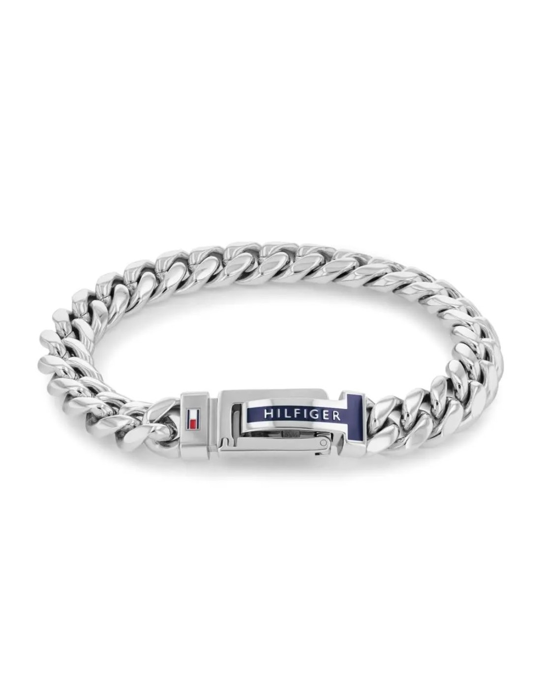 Los llamativos eslabones de cadena de este brazalete blindado crean un aspecto masculino. La pulsera de acero inoxidable de longitud ajustable para hombre tiene un cierre desplegable decorado con esmalte azul oscuro y el nombre de la marca.