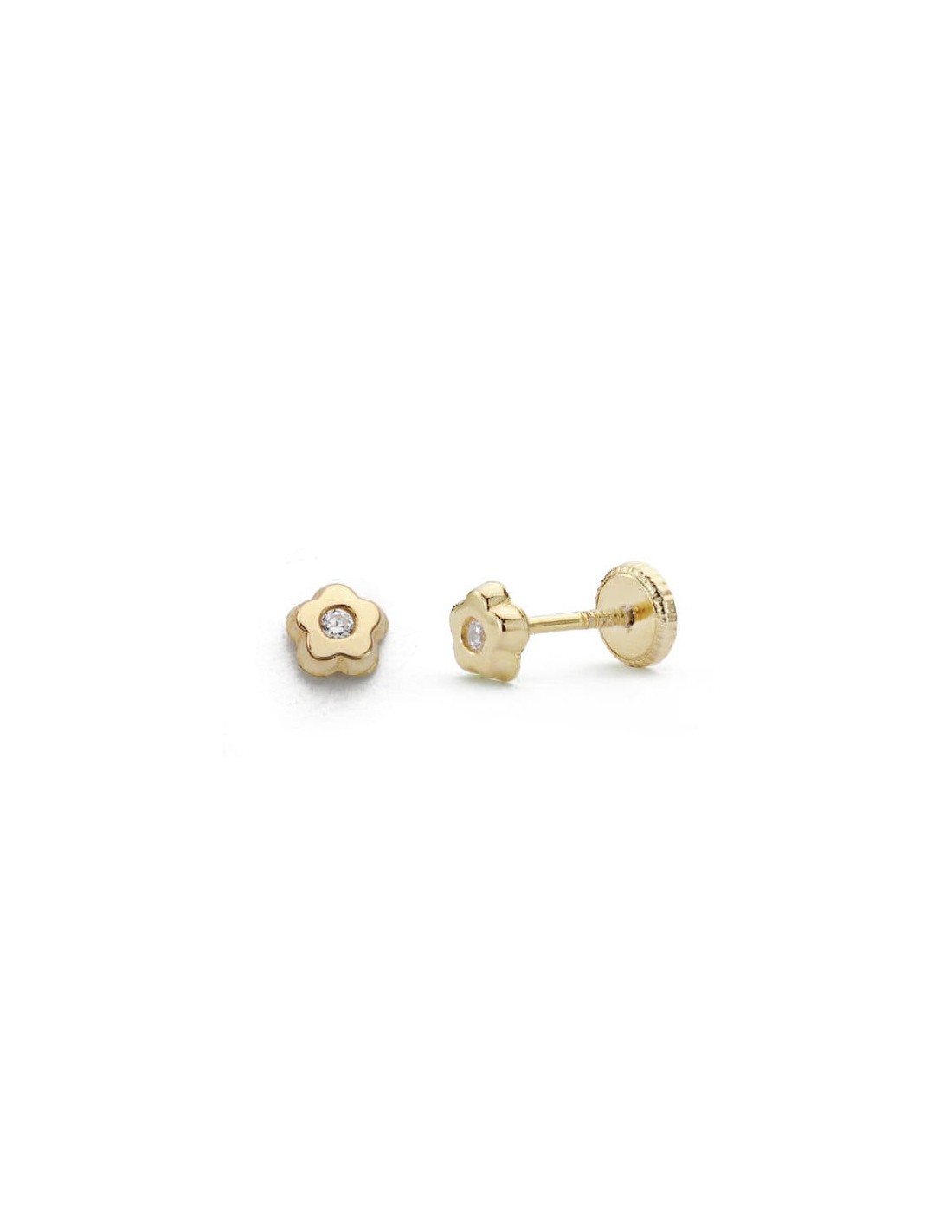 Material: Oro amarillo de 18 quilates, ideal para pieles sensibles, con un acabado pulido que aporta un brillo elegante. Diseño: Forma de flor delicada y sofisticada, con un circonio en el centro que añade un toque de brillo y luminosidad. Cierre: Sistema de rosca, diseñado para máxima seguridad y comodidad en el uso diario de niñas pequeñas.