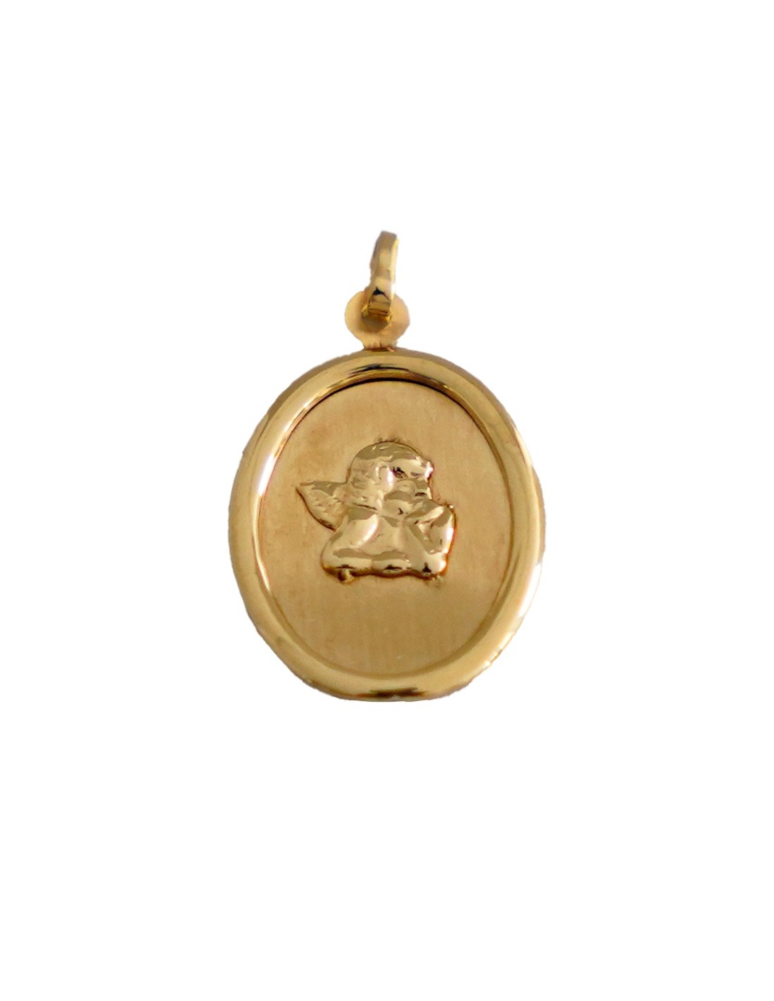 Este colgante en forma de medalla ovalada está elaborado en oro amarillo de 18 quilates (750/1000) y representa a un ángel en relieve, símbolo universal de protección, inocencia y guía espiritual. Su diseño sobrio y elegante combina el acabado liso del fondo con el volumen detallado del ángel, creando una pieza armónica y atemporal. Ideal como regalo de nacimiento, bautizo, primera comunión o como joya personal que acompaña y protege en el día a día.