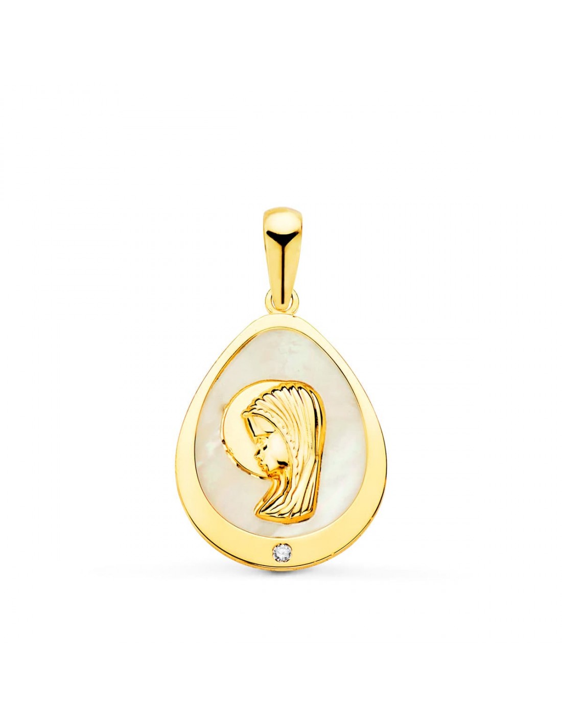 MEDALLA ORO VIRGEN NIÑA LAGRIMA CON NACAR Y CIRCONITA 15X12 MM