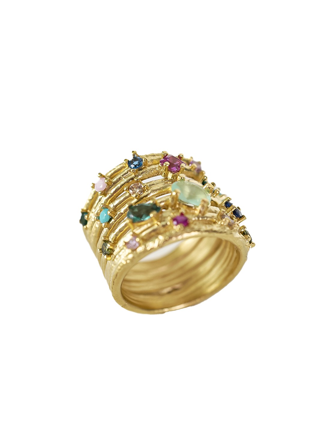 Este anillo no es solo una joya, es una arquitectura de color. Su diseño envolvente en múltiples niveles crea un efecto visual hipnótico, con destellos multicolor que celebran la diversidad, la energía y la individualidad.