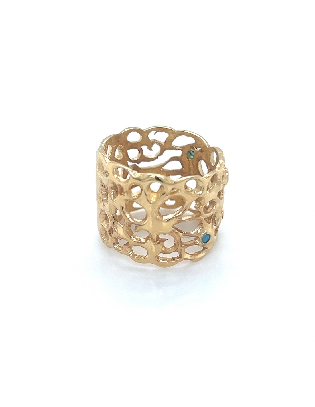 Este anillo ancho de diseño calado en plata de ley 925 destaca por su originalidad y elegancia. Su acabado artesanal con formas orgánicas y fluidas crea un juego de vacíos que le aporta ligereza visual y un estilo contemporáneo. Pequeñas circonitas de colores engastadas con delicadeza aportan destellos sutiles que realzan la pieza sin recargarla. Ideal para lucir solo o combinado, este anillo es perfecto para mujeres con personalidad y gusto por las joyas únicas.