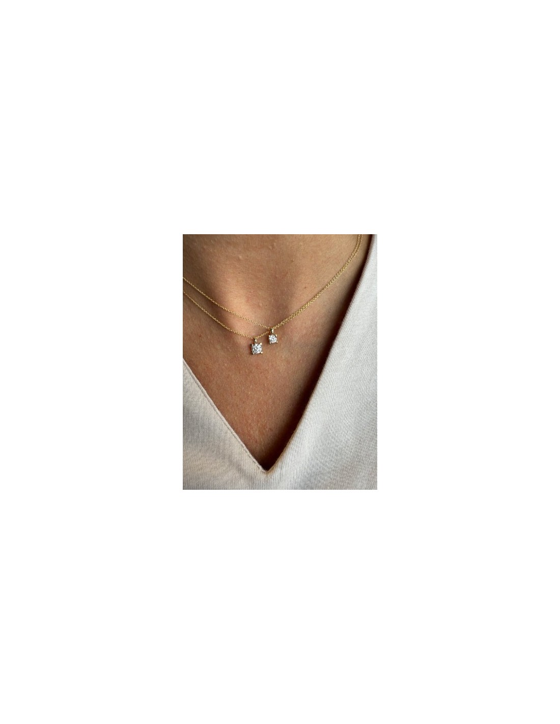 Un diseño sutil y equilibrado que resalta el brillo del diamante, creando una pieza minimalista y versátil, perfecta para acompañarte en cualquier ocasión. El collar puede montarse tanto con cadena de oro como con cordón de macramé, ofreciendo dos estilos distintos para adaptarse a cada personalidad.