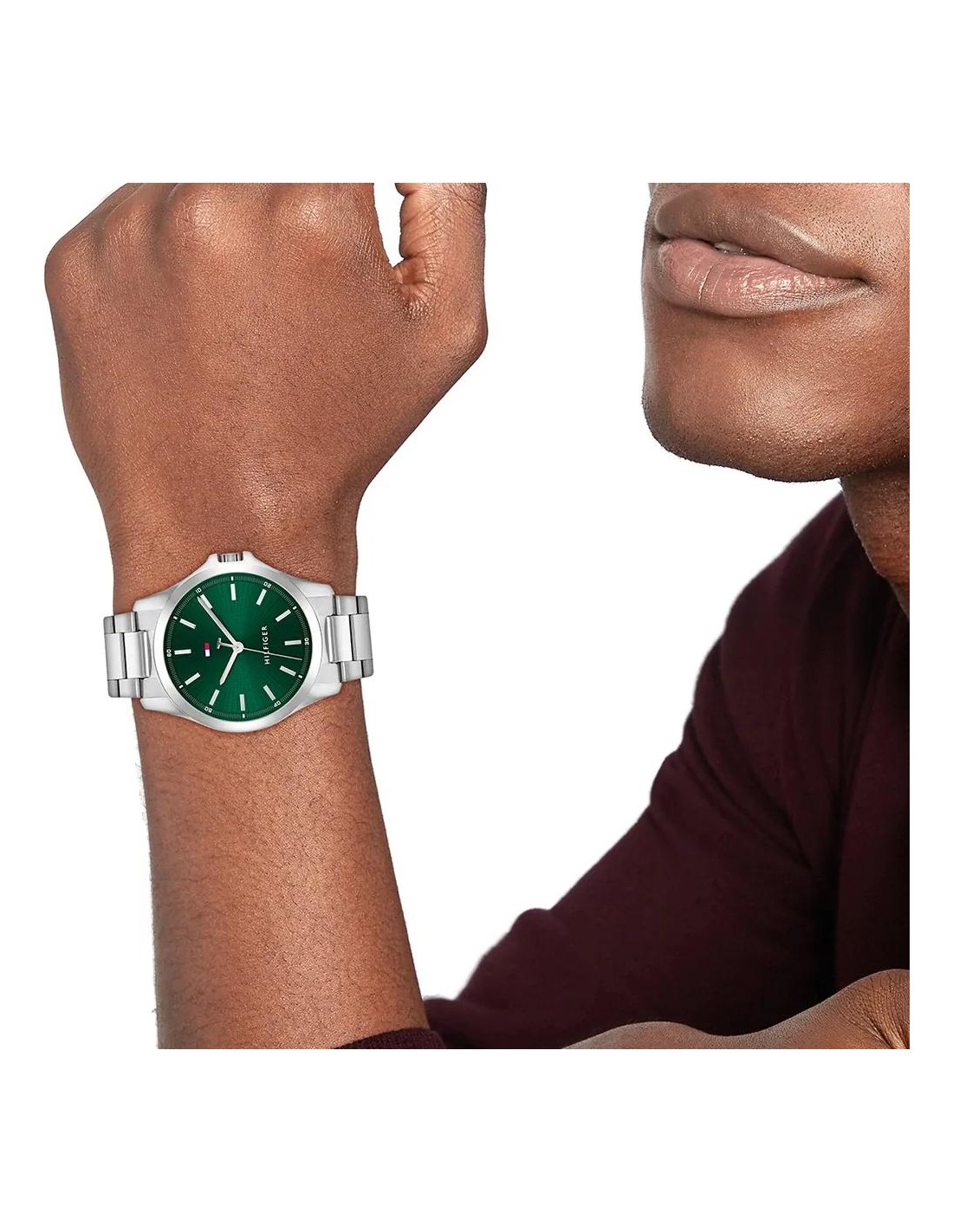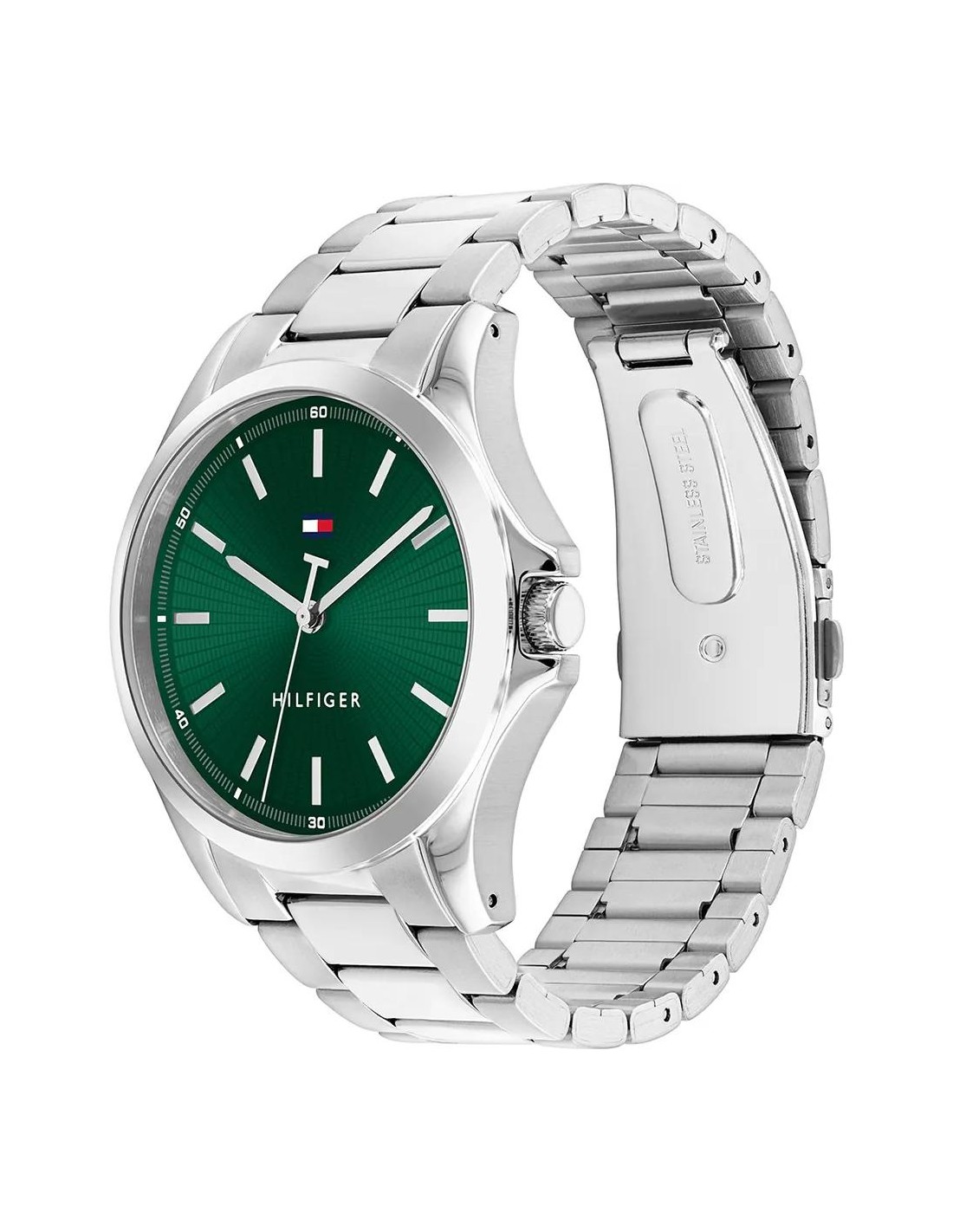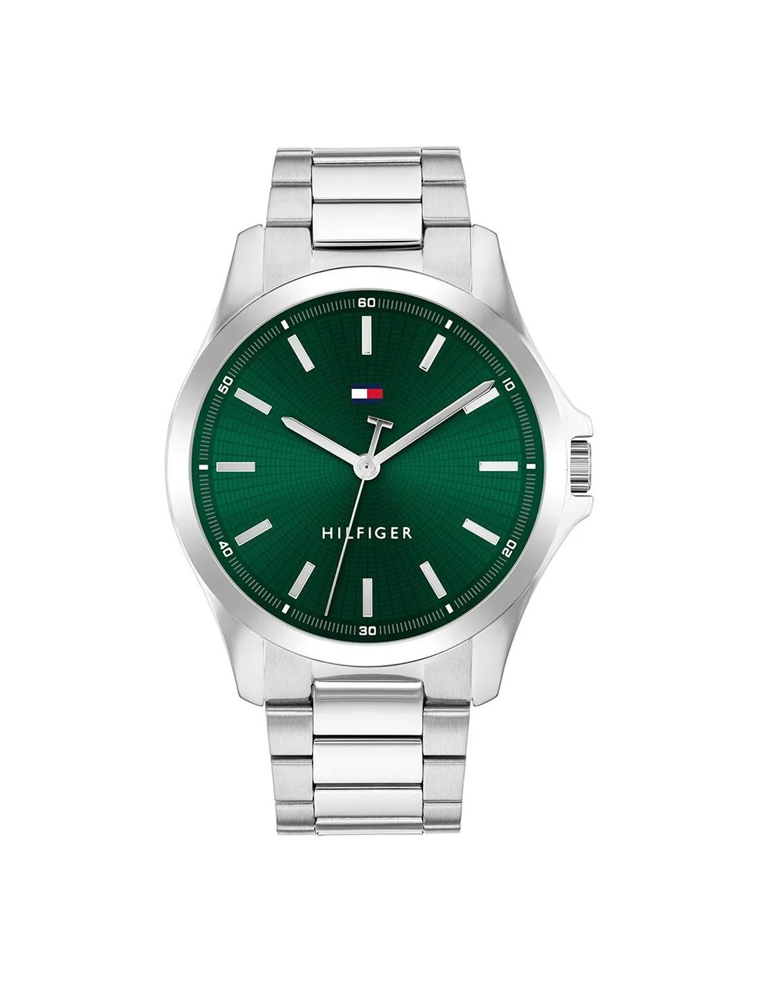 Este reloj marca Tommy Hilfiger tiene una caja de Inox con un diámetro de 43 mm y cuenta con una correa de metal. Dentro de la caja se encuentra un mecanismo de Seiko de alta calidad el cual esta protegido por un cristal Mineral.
