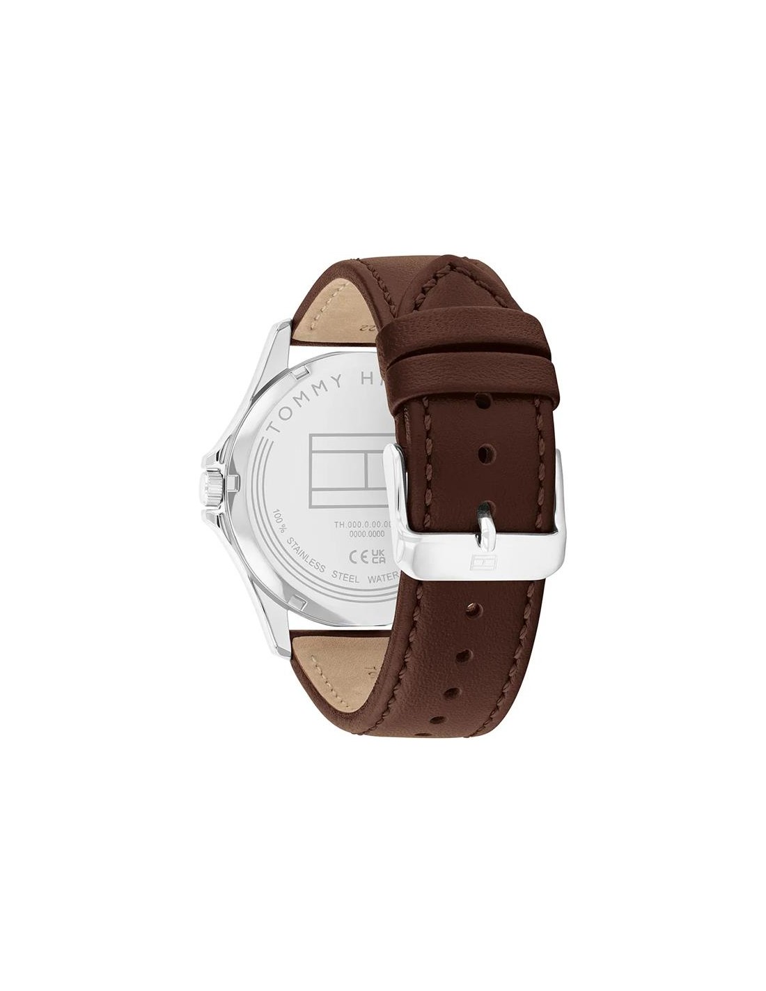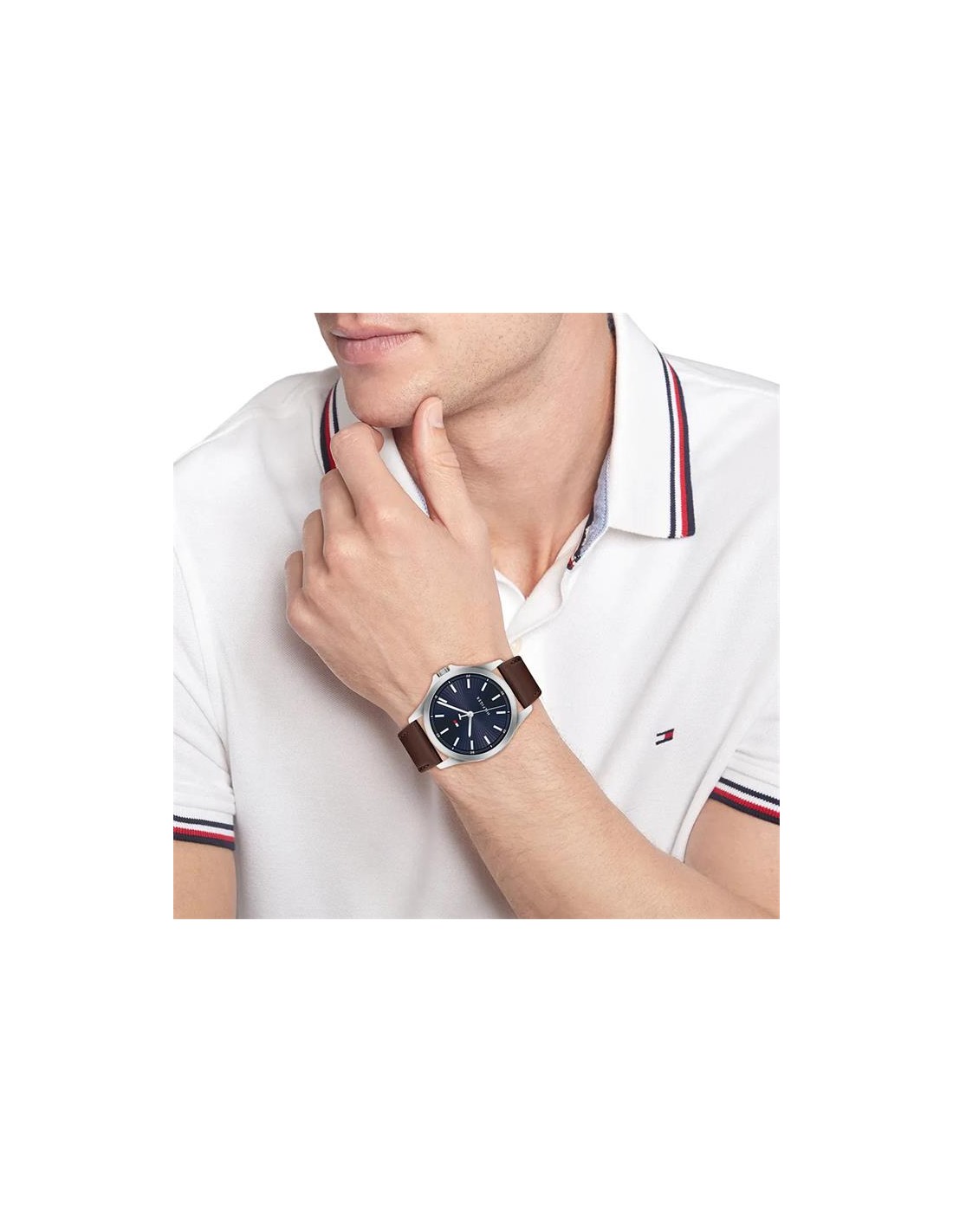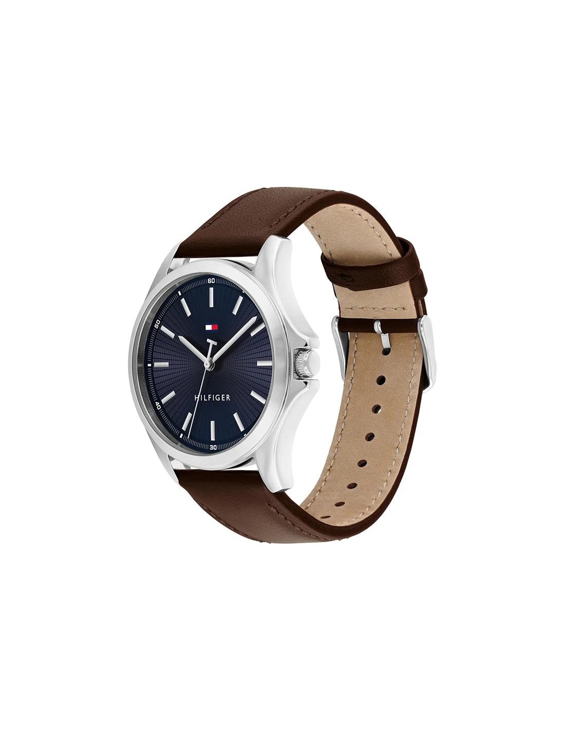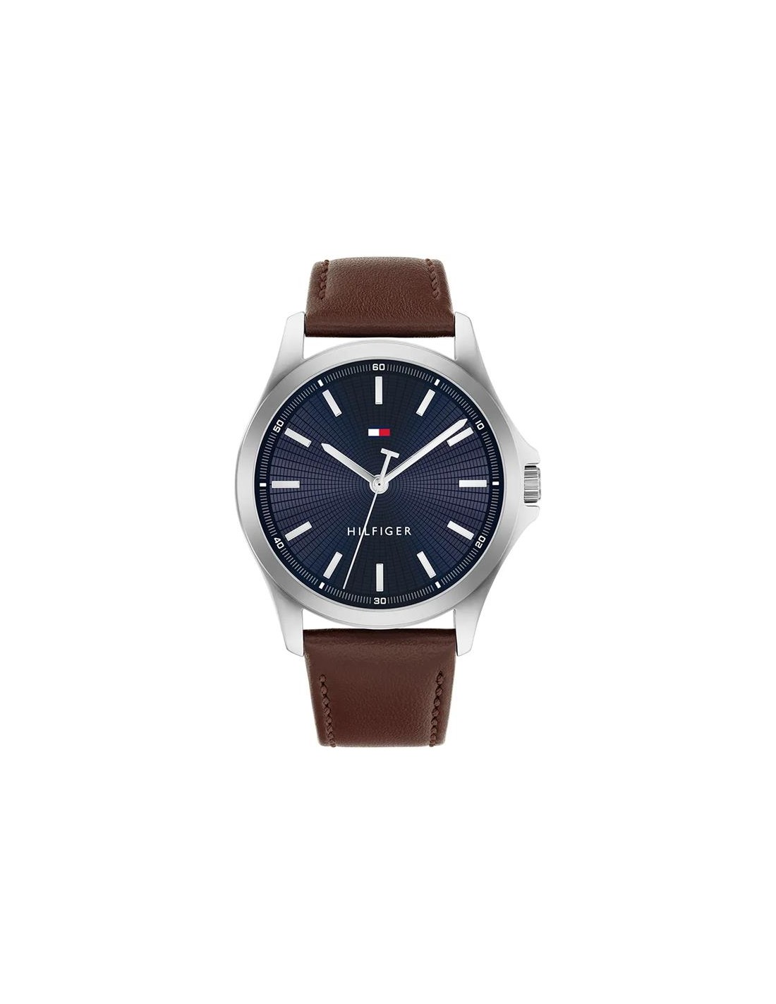 Reloj Tommy Hilfiger para hombre de la colección Bruce fabricado en acero inoxidable plateado y piel en color marrón. Se trata de un reloj de diseño elegante y clásico compuesto por caja de 43mm de diámetro con bisel plateado que contiene esfera azul con indicadores compuestos por barras plateadas al igual que sus agujas movidas por mecanismo de cuarzo analógico. Todo ello protegido por cristal mineral. Su correa es de piel en color marrón con cierre de hebilla. Resistente al agua hasta 3 ATM.
