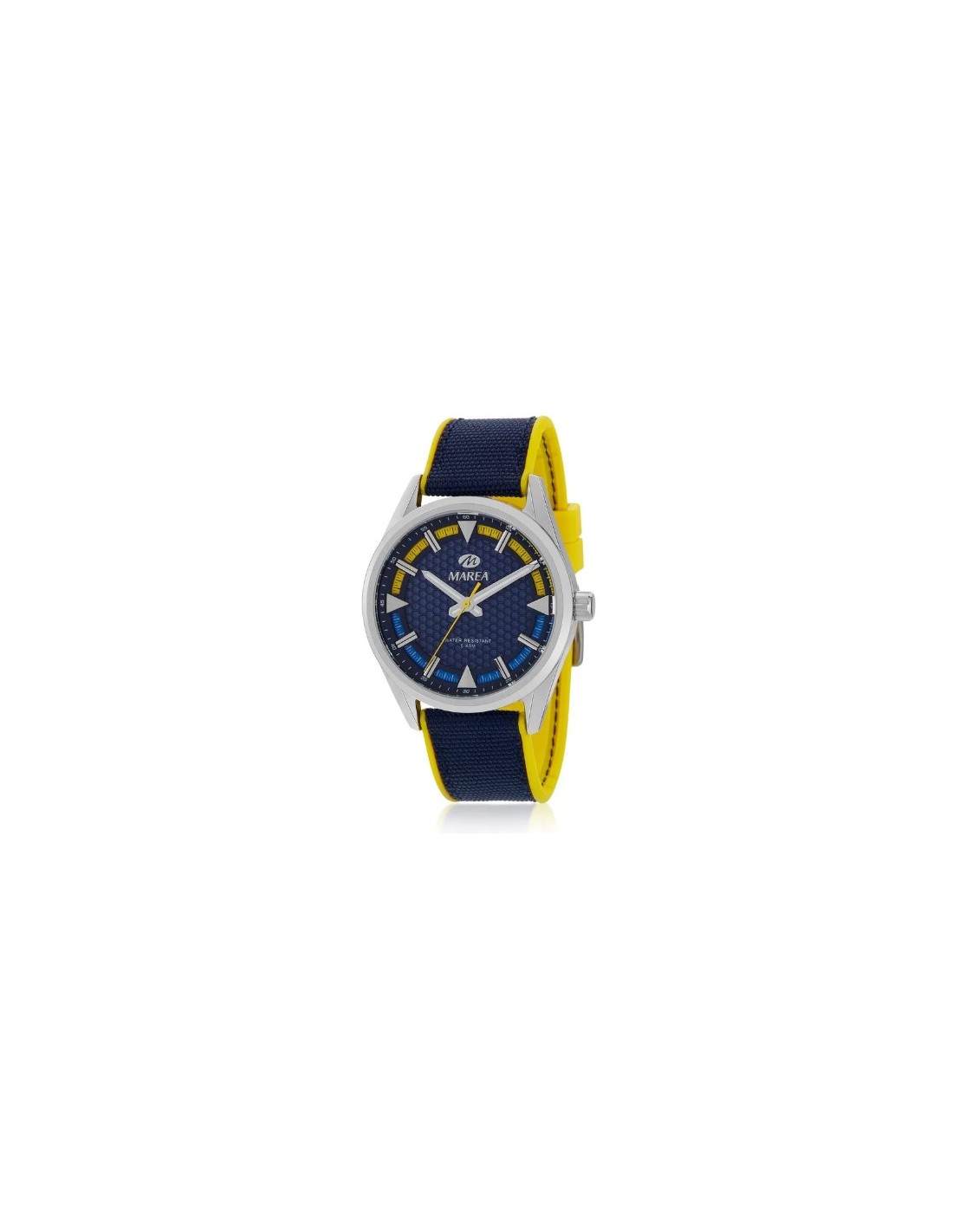 Correa de nylon azul con caucho amarillo.