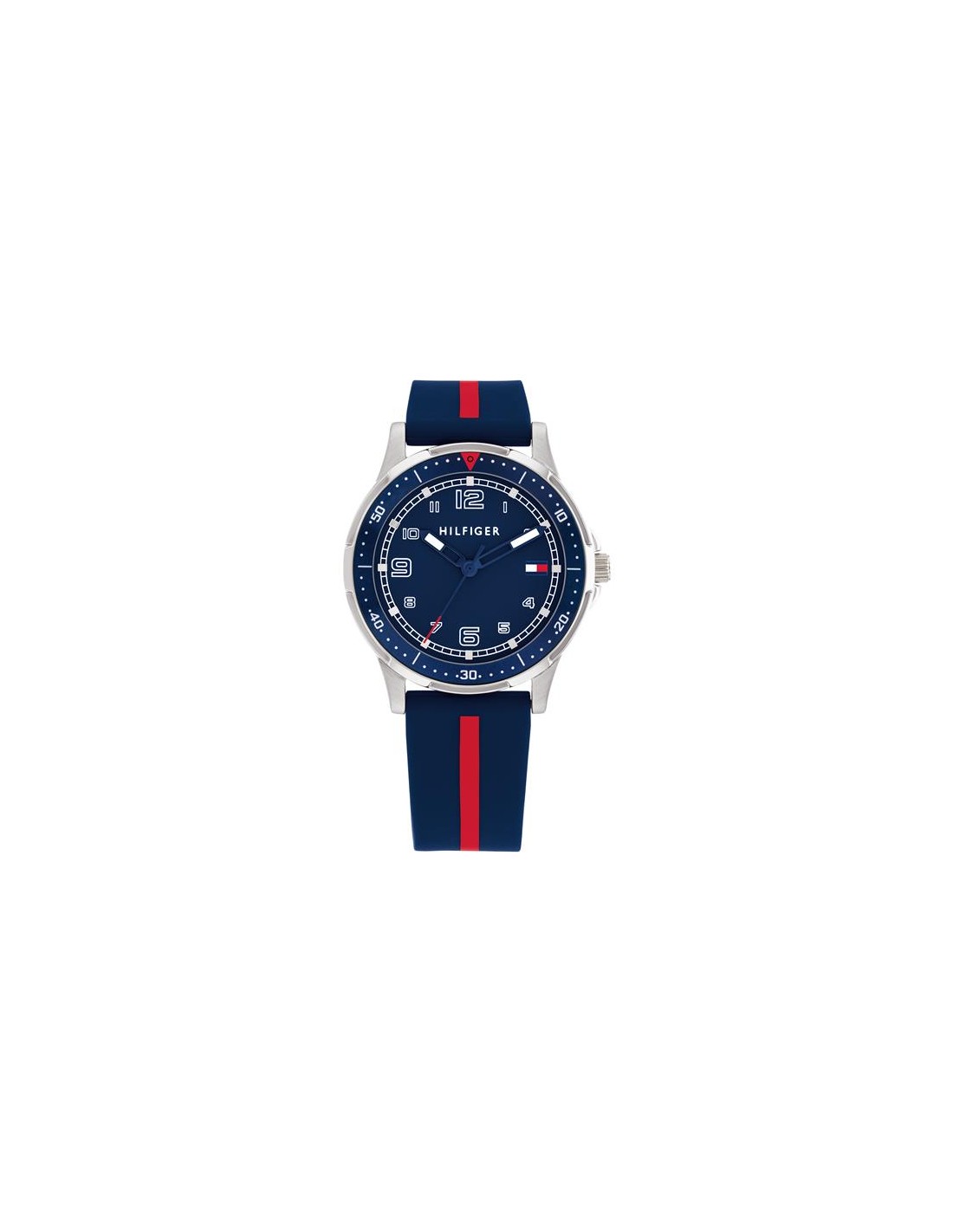 Reloj Tommy Hilfiger para niño de la colección Boys Communion fabricado en acero inoxidable y silicona. Se trata de un atractivo reloj compuesto por caja plateada de 34mm de diámetro con esfera azul que contiene agujas azules y blancas movidas por mecanismo de cuarzo analógico protegido por cristal mineral. su correa es de silicona en color azul con una franja roja central. Su cierre es de hebilla. Resistente al agua hasta 30 metros.